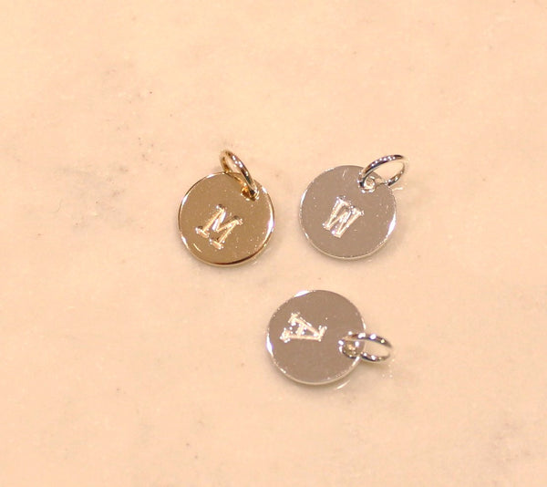 A small initial charm available in sterling silver and gold filled, with an attached jump ring so you can easily slide it onto your chain. The disc measures 3/8" or 9.5mm. All components are either sterling silver or gold filled.